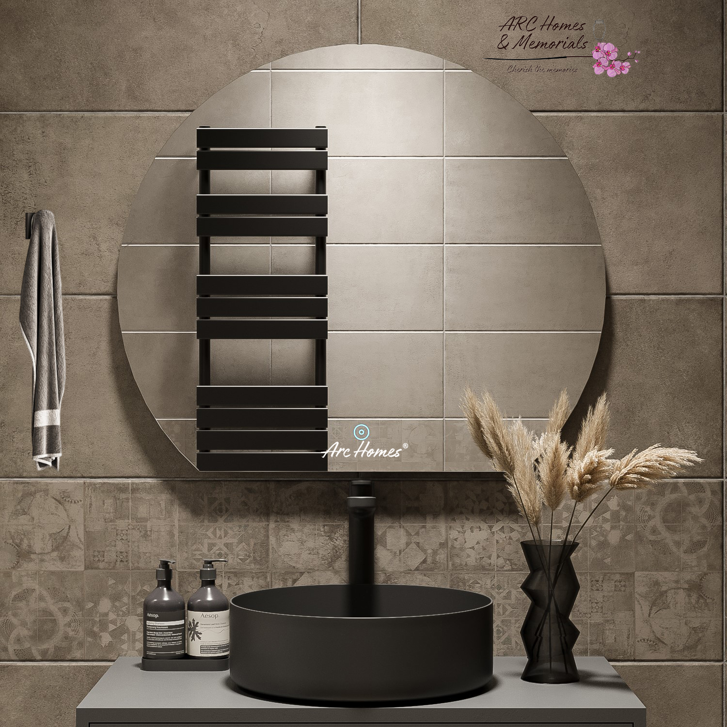Tags: led mirror, round mirror, semi round, wall mount